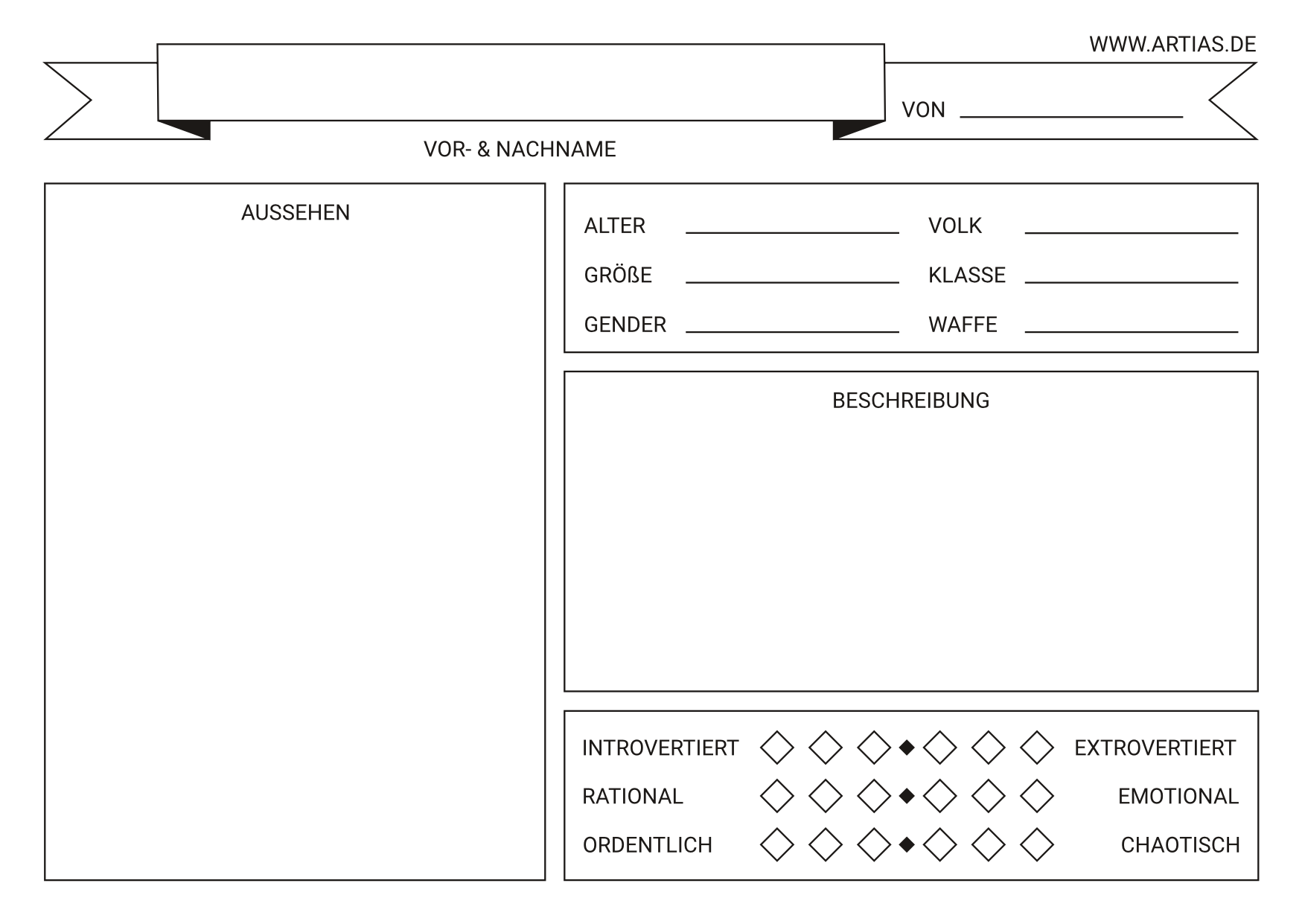 Level deinen Charakter indem du Aufgaben vom schwarzen Brett erledigst. Zeichne oder beschreibe ihn dabei in verschiedenen Situationen, um dich selber herauszufordern.